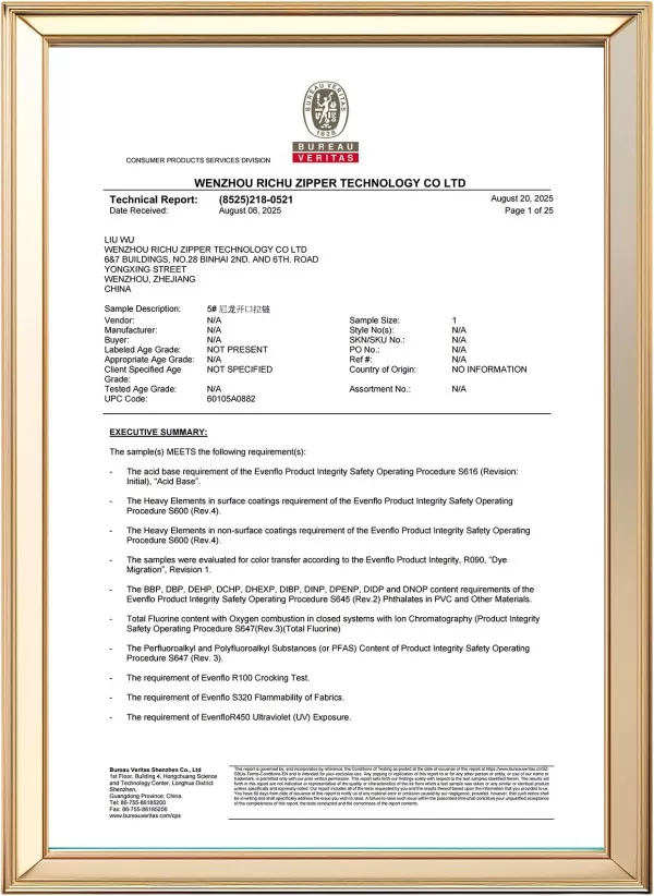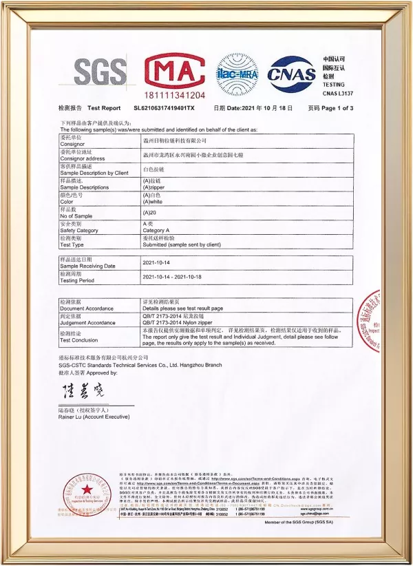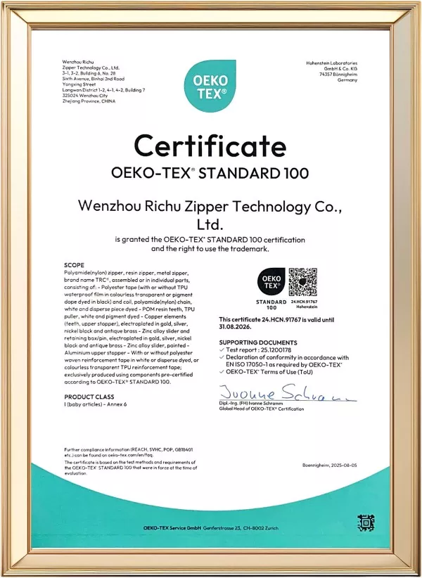 يخضع كل سحاب TRC لقوة الشد، ومقاومة الانفجار، والنعومة، وثبات اللون، واختبار المتانة وفقًا للإجراءات التي تديرها ISO.