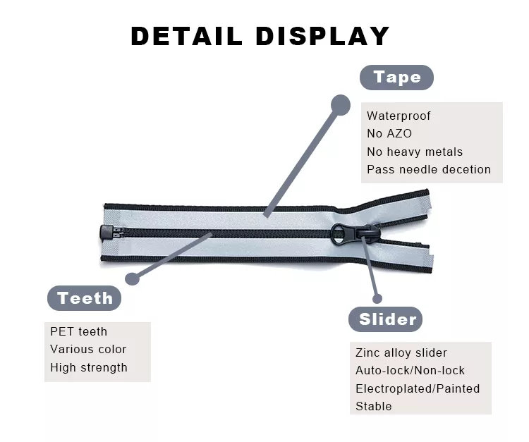 يوفر سحاب النايلون المقاوم للماء من TRC ثلاثة تشطيبات سطحية: غير لامع، ولامع، وشبه لامع. ومن بين هذه اللمسات النهائية، فإن اللمسة النهائية غير اللامعة (البلورية) هي الأكثر استخدامًا، تليها اللمسة النهائية شبه اللامعة. يعمل هذا المنتج بسلاسة وهو مقاوم للتآكل ومتين، ويجمع بين وظيفة الحماية والمظهر الجمالي.